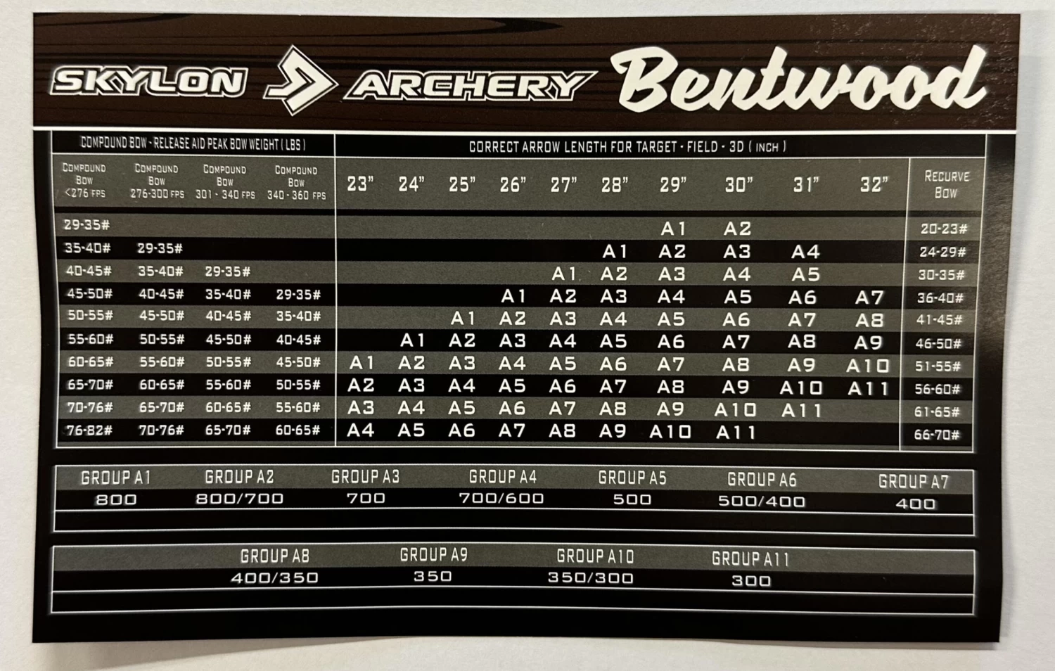 33″ Carbon Arrow, variable spines with 4″ feather fletchings. Sold as a pack of 12.